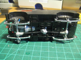 One challenge was getting 8 wheels to all ride at the same height, and it seems the rearmost axle sits a bit high and doesn't touch the ground, or perhaps the third axle sits too low and needs to sit further up into the chassis. This is unrelated to the slight upturn in the body seen at the back, which I may try to fix before final assembly.
