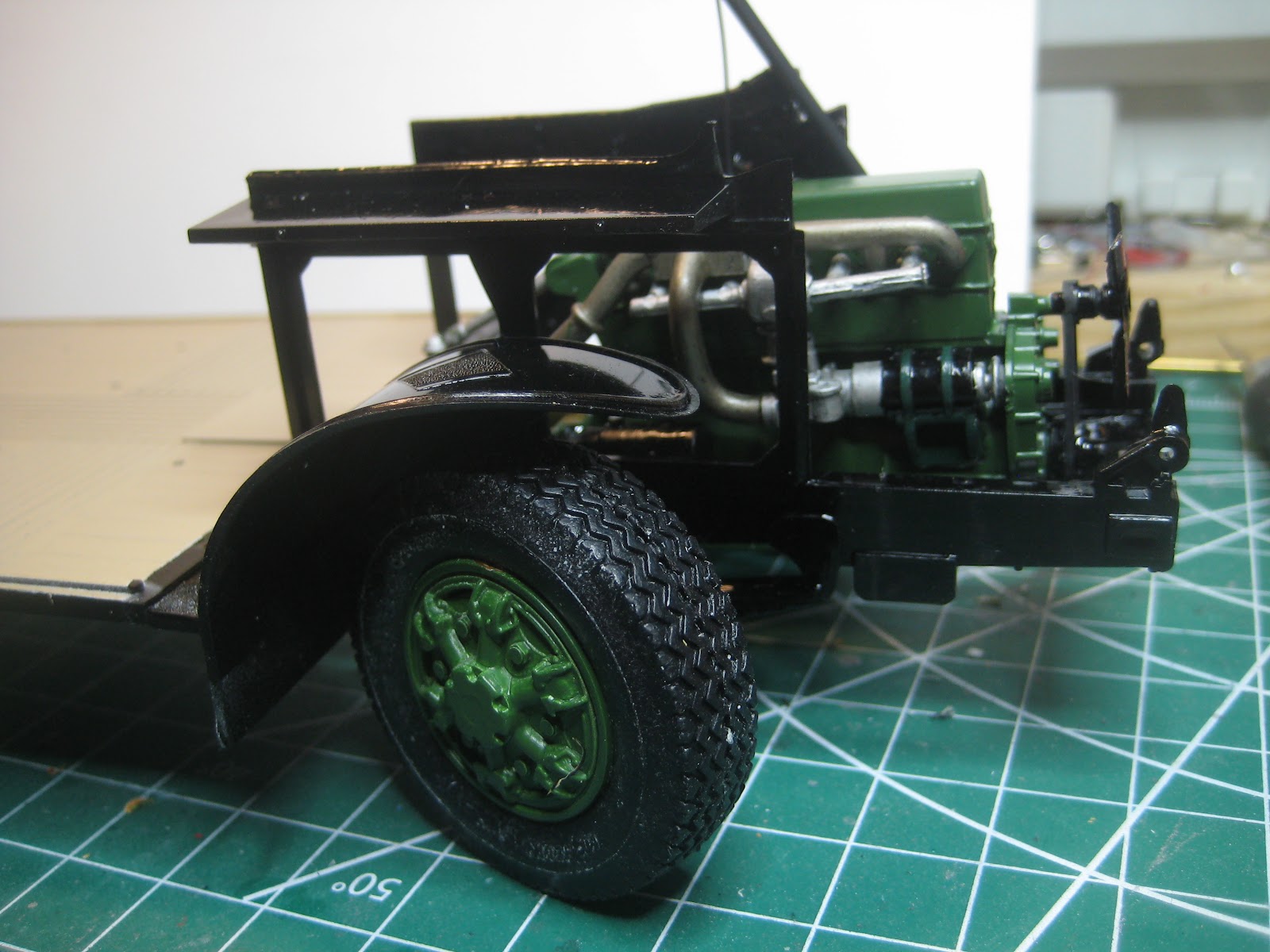 Sadly I did not inspect the kit properly when I acquired it over the Interweb some time ago, and have now discovered it is missing an entire sprue, including the sides of the bus body as well as the cab floor, engine side access hatches, grille and hood among other things. So with the seats and internal partitions all painted and ready to go, the kit has been moved back to the Shelf of Doom until I can source the missing bits, likely by buying an entire second kit. Lesson learned... I'll have to pick up some more green and cream paint, too, as the surfaces that need paint coverage are quite large.